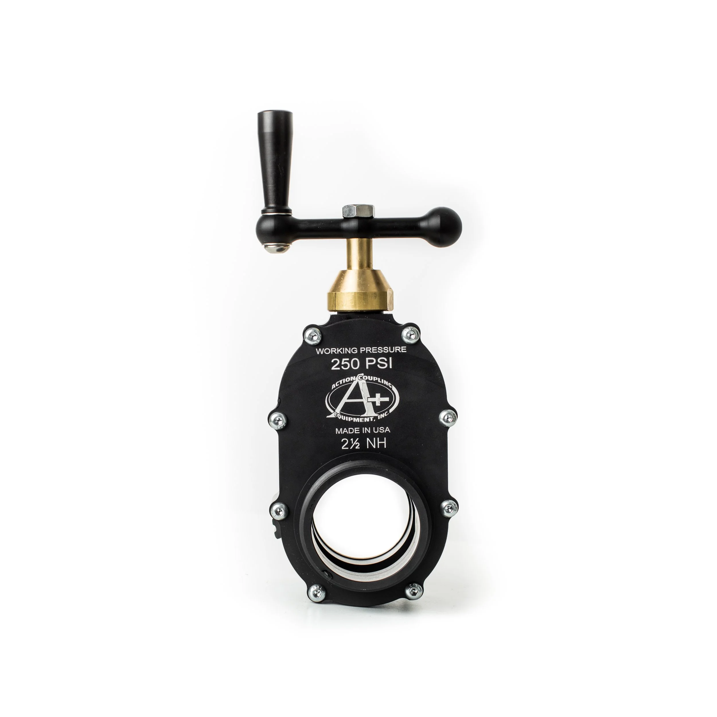 Action Coupling's new light weight, heavy-duty 2-1/2" NH Female X NH Male gate valve is made from 6061-T6 extruded aluminum. This valve is machined from solid billet aluminum (not cast). This valve offers excellent shutoff control directly off the hydrant or other water source. The unique design gates the water so that the valve body is not pressurized while the valve is closed. The non-rising spindle with full 2-1/2" waterway flow allows for complete range from open to closed in 11 revolutions. The surface finish is a Black Hard Anodized Type III Class 2 process that will provide years of protection. The extruded body and design allows for easy rebuild and maintenance of internal parts. Every hydrant gate valve is tested in static and flow pressure parameters. Available in special threads. Made in the USA.